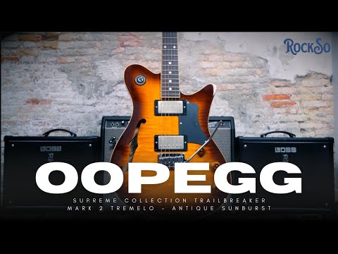 This Oopegg Supreme Collection Trailbreaker Mark-2 is a cutting-edge prototype with a 2-point tremolo, curly maple top, and F-hole for enhanced resonance. It combines comfort and style with its lightweight design and stunning bound neck and body, while the custom humbuckers deliver unparalleled tone. Plus, the push-pull pot allows for a passive capacitor filter, giving you even more control over your sound.